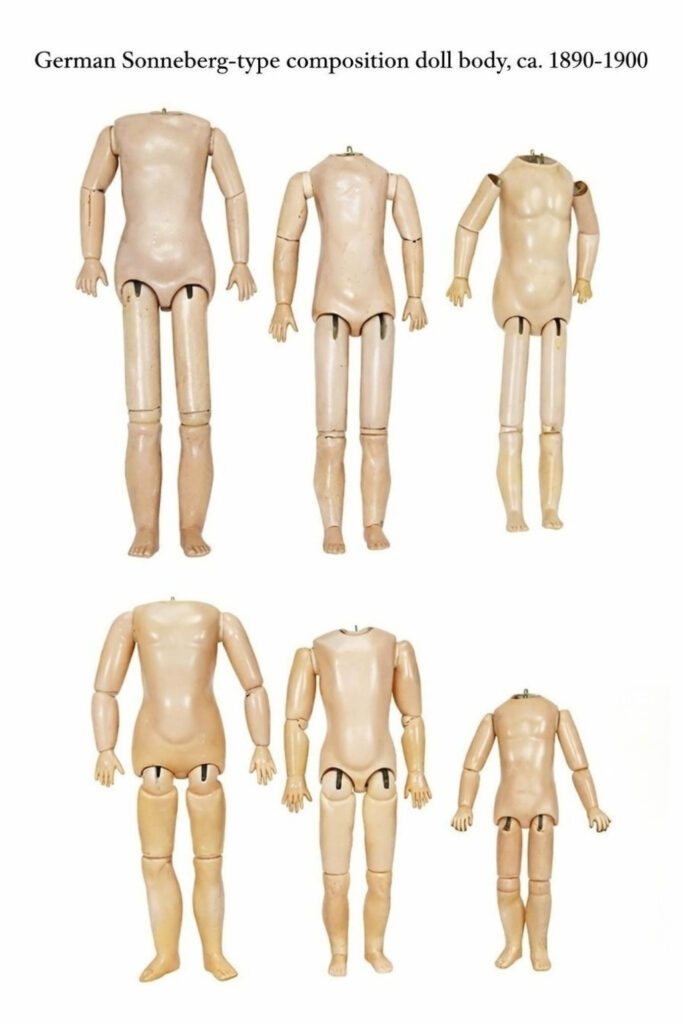 In contrast, Sonneberg-type bodies represent a market-oriented, assembly-driven model: seams are often smoothed or minimized, proportions appear more slender and visually balanced, joints are lighter and more flexible, surface finishing is more uniform, and export markings such as “Germany” may be present.