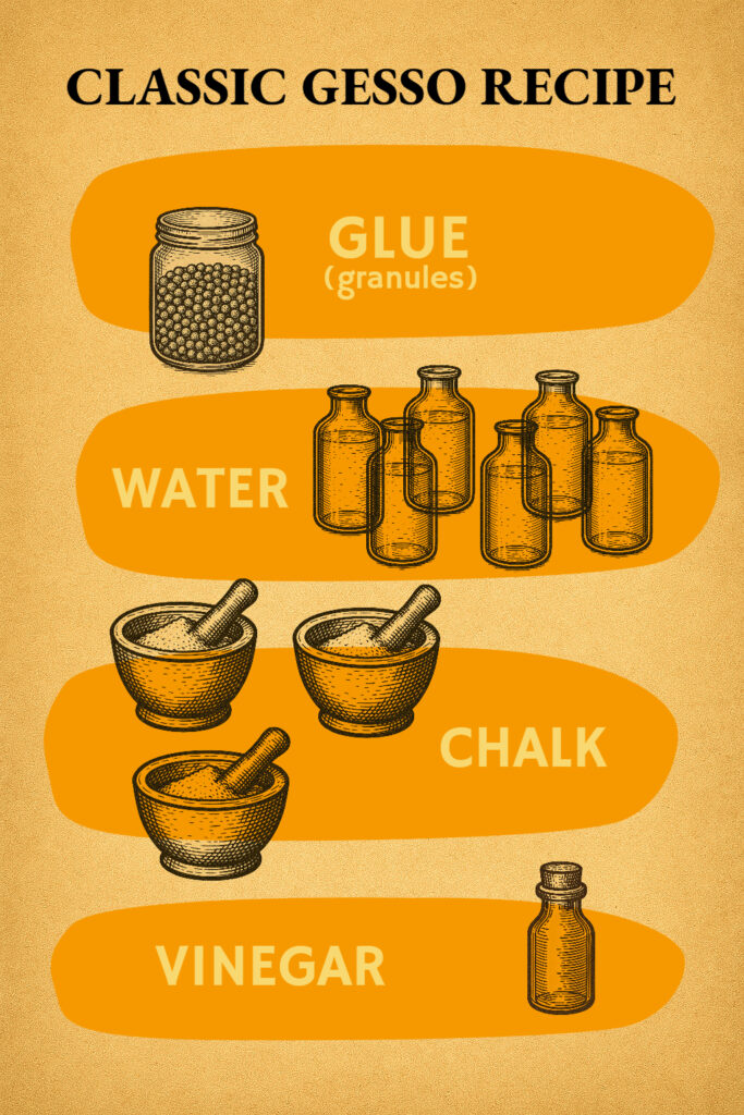 This is classic chalk gesso based on hide glue. It provides a strong, smooth surface for painting.